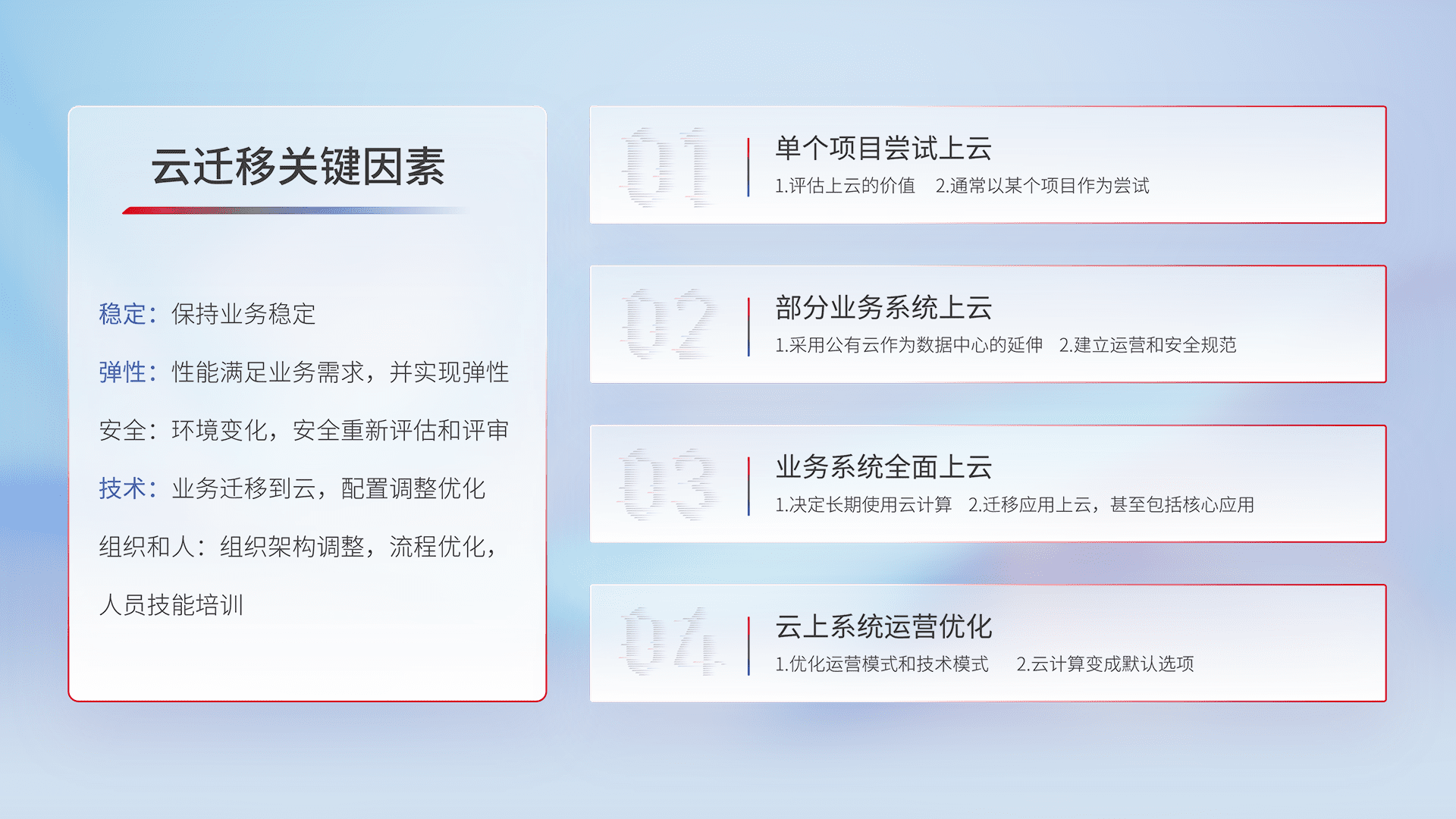 结合实际业务,,,,从规划设计、、、云平台选型、、、、云原生改造、、、数据迁移、、、、集成交付,,,迁移全过程为客户识别最佳上云路径,,,做好风险识别管理,,,,设计网络架构、、、身份权限、、、、安全审计合规、、操作审计、、日志审计、、监控告警策略、、多站点容灾设计等,,,,对云上基础设施进行整体规划,,,提升IT治理水平,,,以满足弹性、、、高可用、、高性能的需求。。。