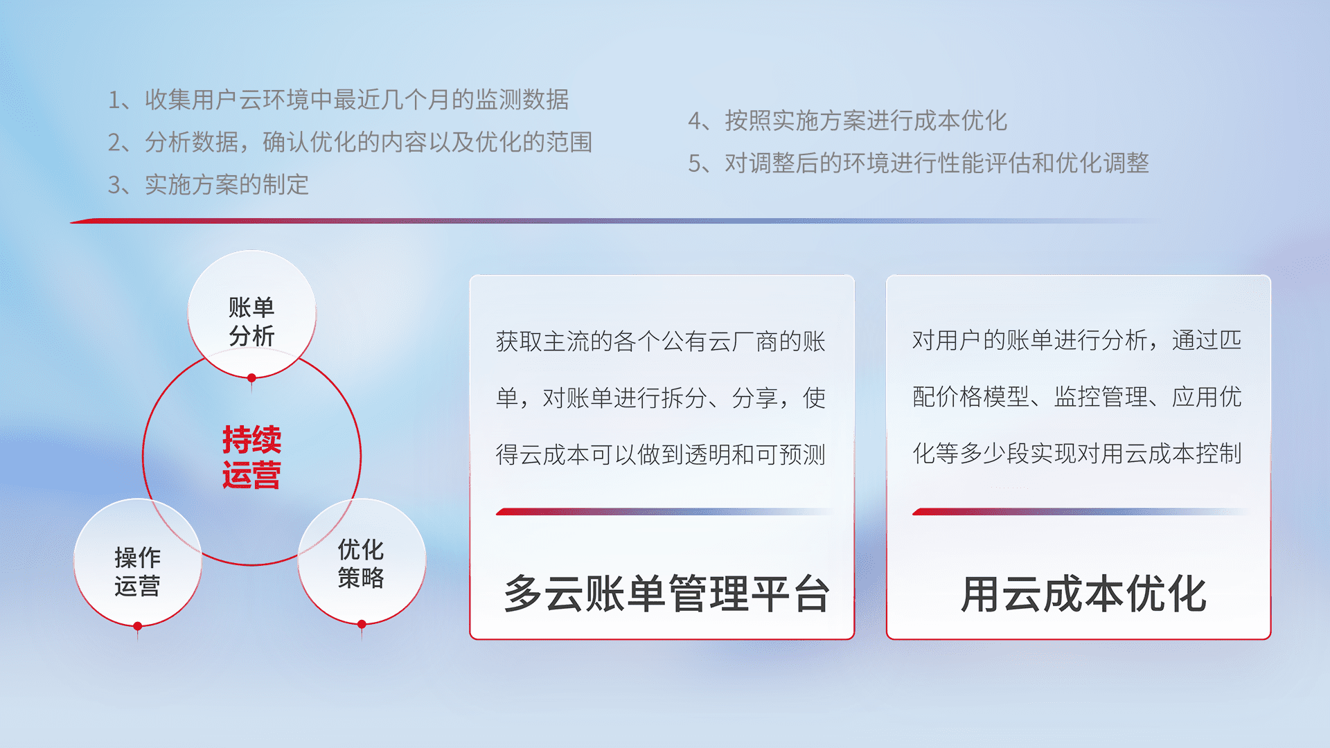 通过多云纳管,,,以统一的资源数据模型把客户的云资源进行抽象和封装,,,,进而实现对多云资源的统一操作,,保障云资源管理的可靠性、、、稳定性与可用性。。。量身定制化运维内容,,,配置、、开发运维、、补丁管理、、、备份、、监控、、认证和访问管理、、审计和日常巡检等,,,,保障在用云过程中的可靠度,,稳定度以及高可用率。。。